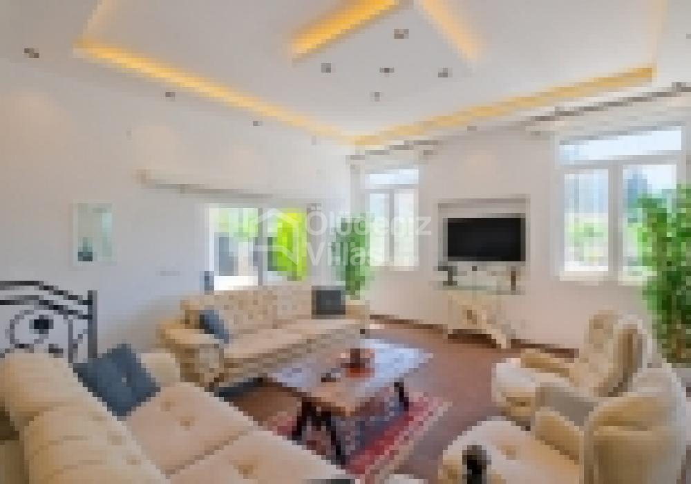 Wohnzimmer: Essbereich für 8 Personen, Sitzgruppe, Klimaanlage und Fernseher.