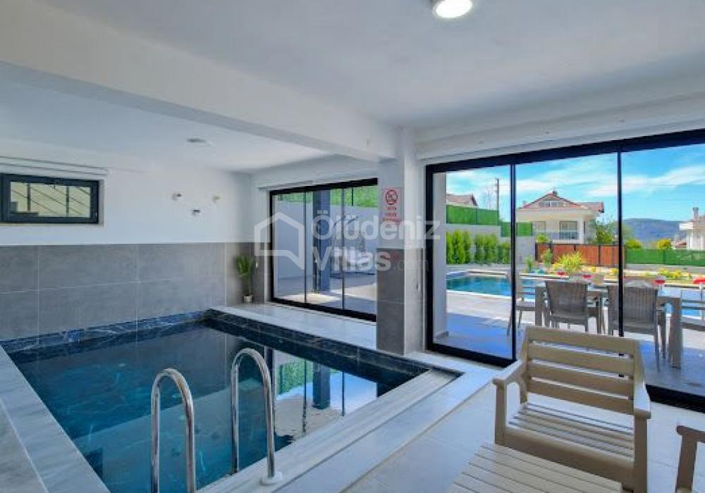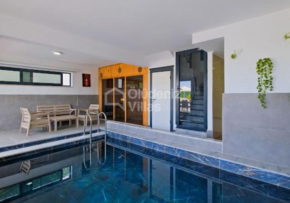 La villa cuenta con piscina exterior privada y piscina interior climatizada.