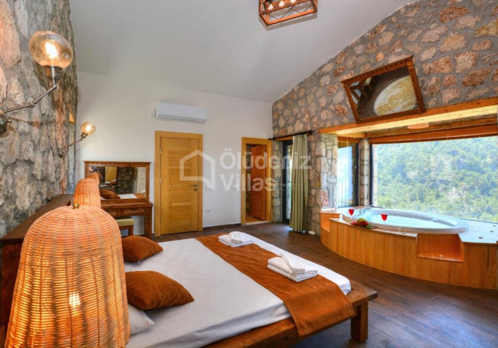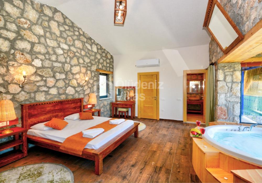 1. Спальня: Двуспальная кровать, джакузи, кондиционер, ванная комната, раковина.