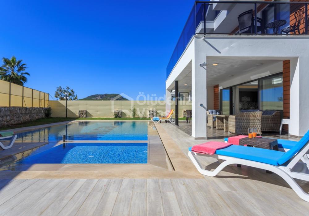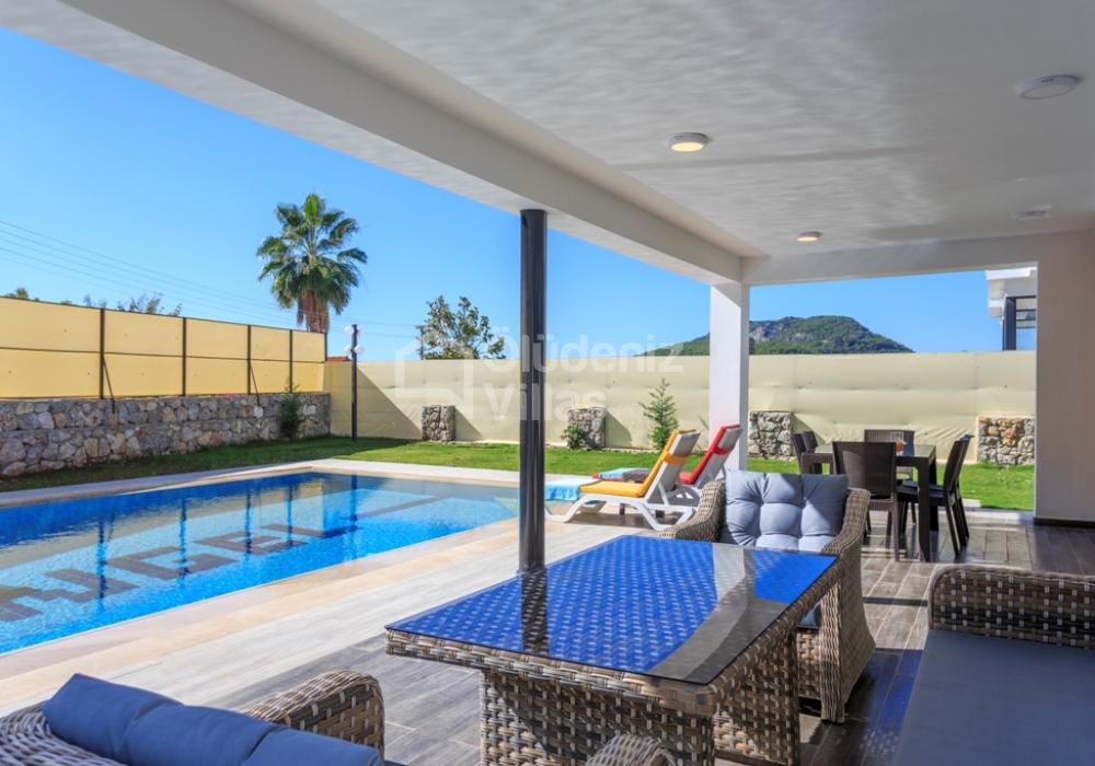 Сад: шезлонги, зонтики, душ, зона отдыха, барбекю, стол, стулья.