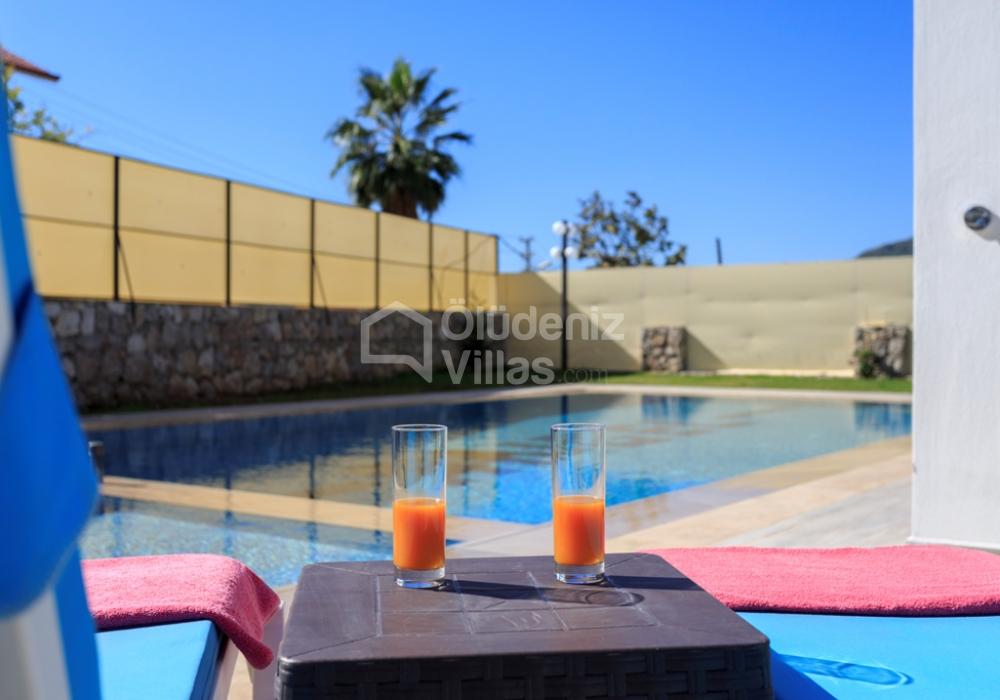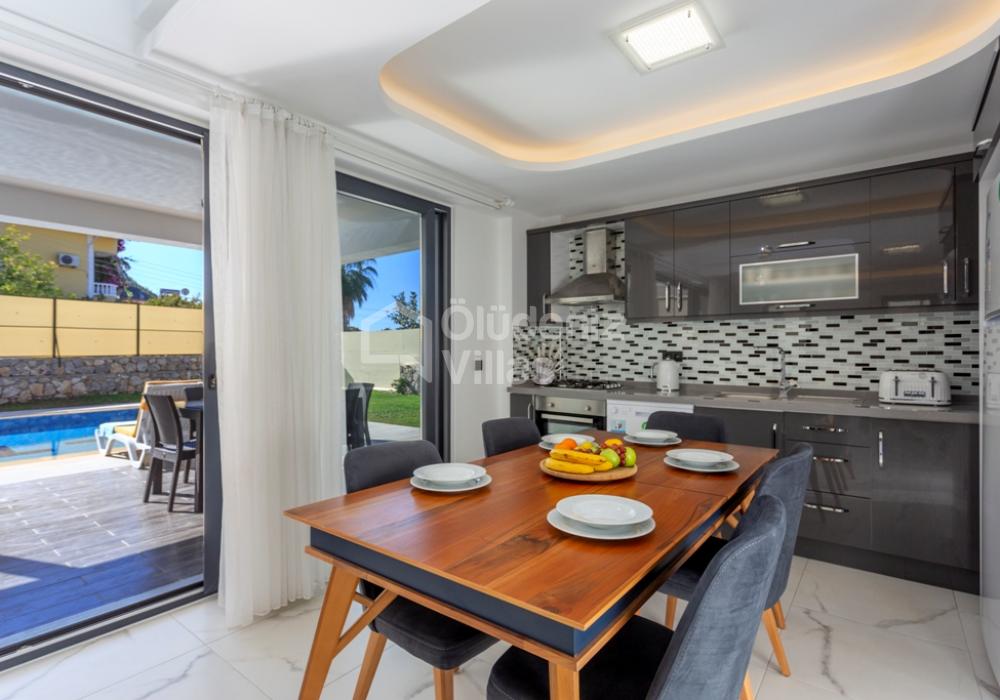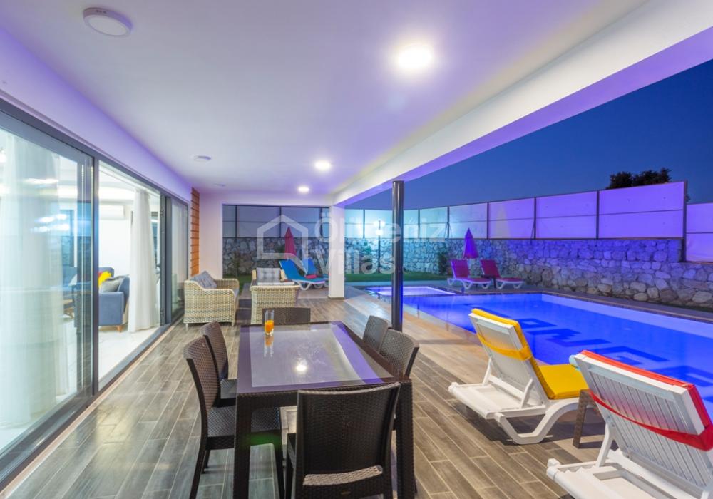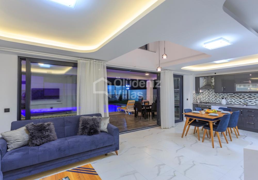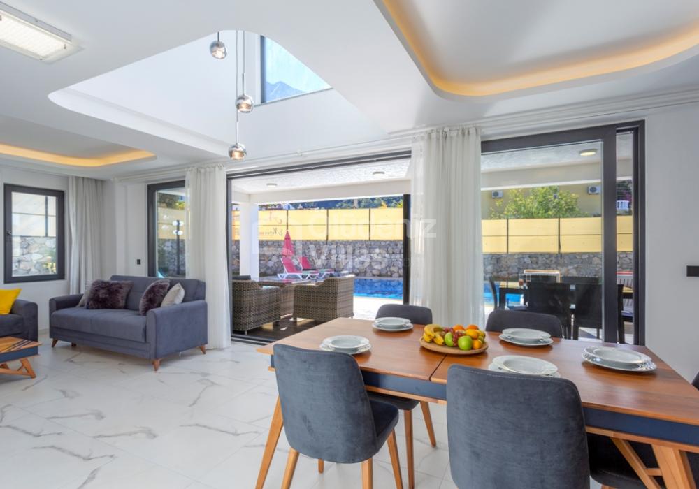 Гостиная: Гостиная, WC, спутниковое ТВ, LCD TV, интернет, кондиционер, обеденный стол, стулья и выход к бассейну.