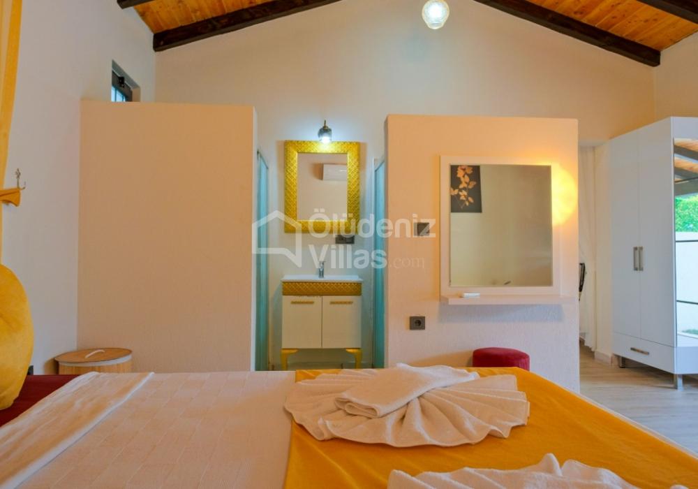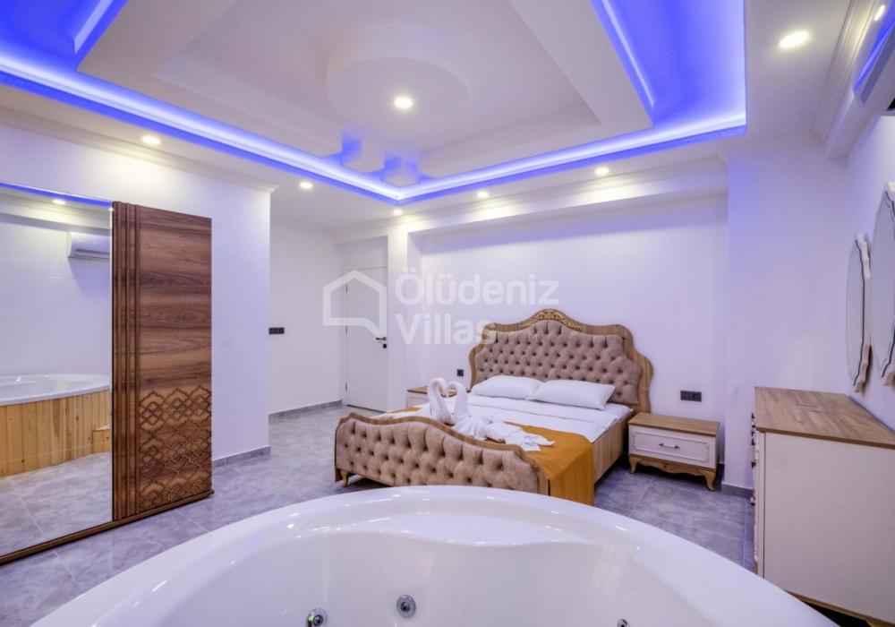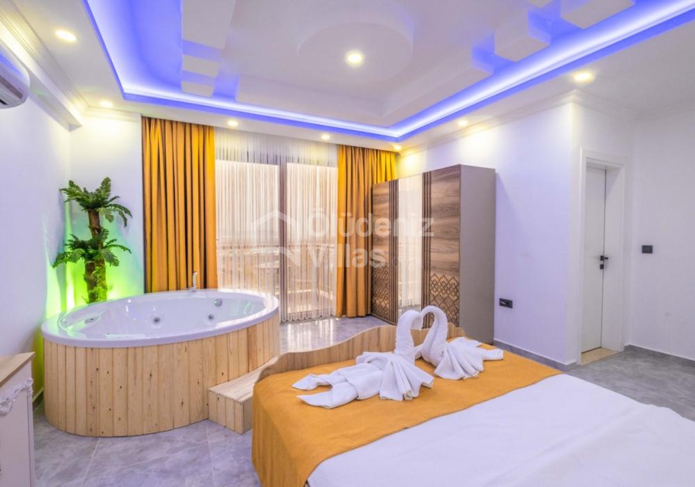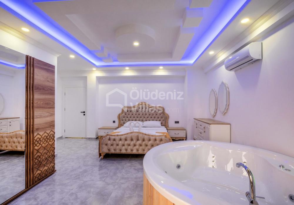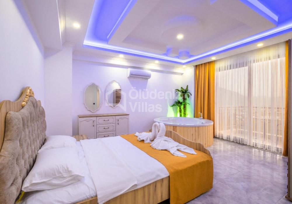 2. Спальня: Двуспальная кровать, кондиционер, джакузи, шкаф, прикроватная тумбочка, косметический столик с зеркалом, раковина, ванная комната.