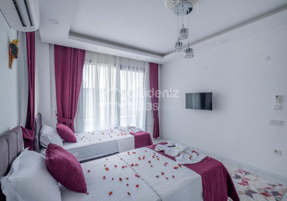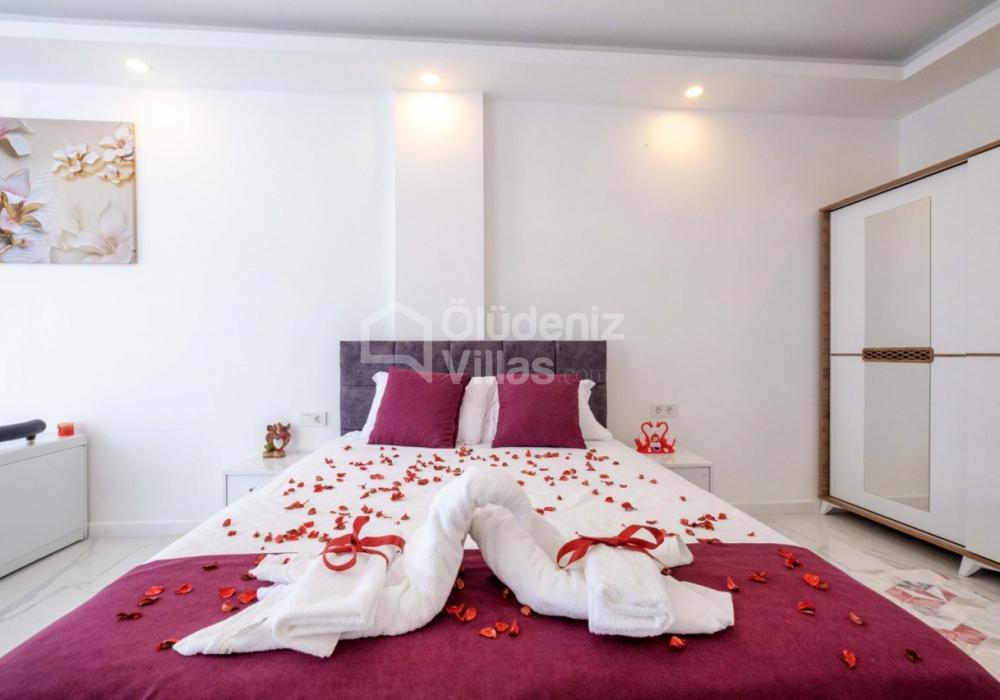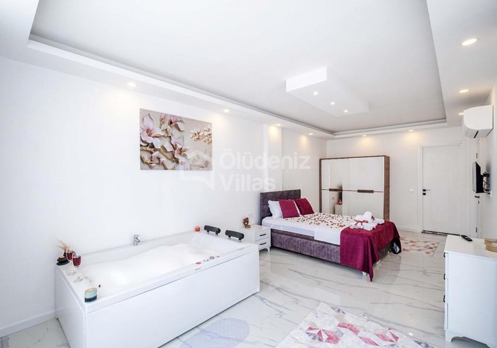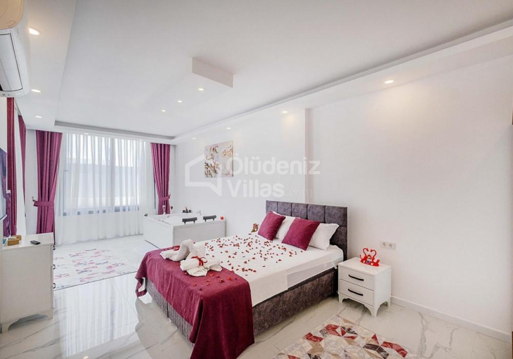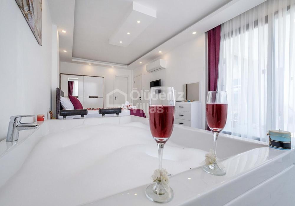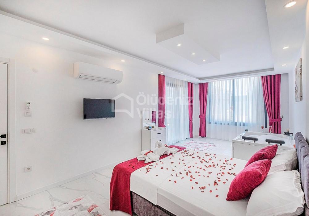 1-я спальня: двуспальная кровать, джакузи, шкаф для одежды, зеркальный косметический столик, кондиционер, телевизор.
