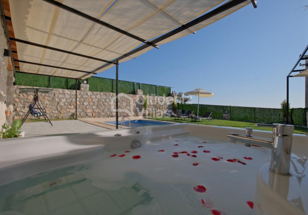 Вилла имеет частный бассейн, огороженный высокими стенами, что обеспечивает приватность от посторонних взглядов. Терраса с джакузи рядом предлагает идеальное место для расслабления и наслаждения природой.