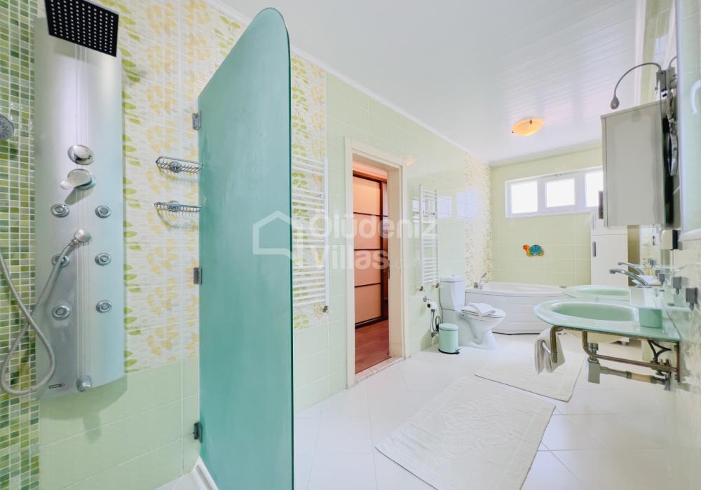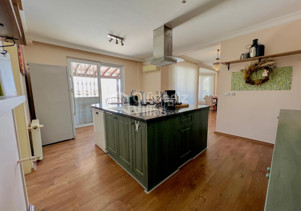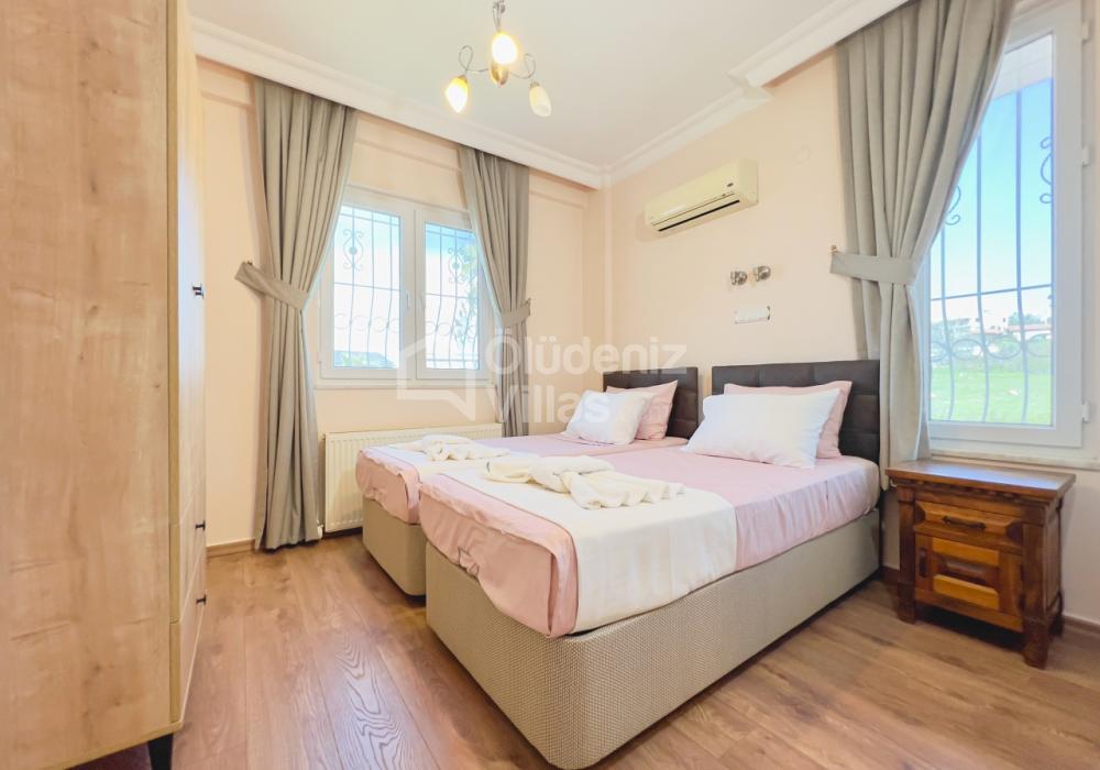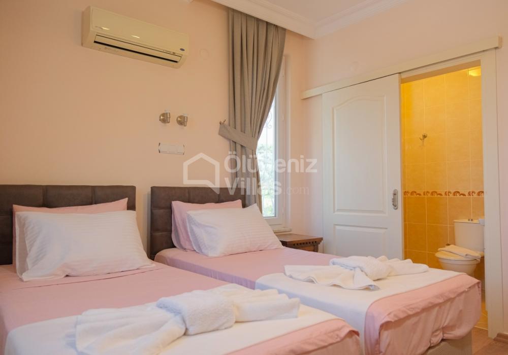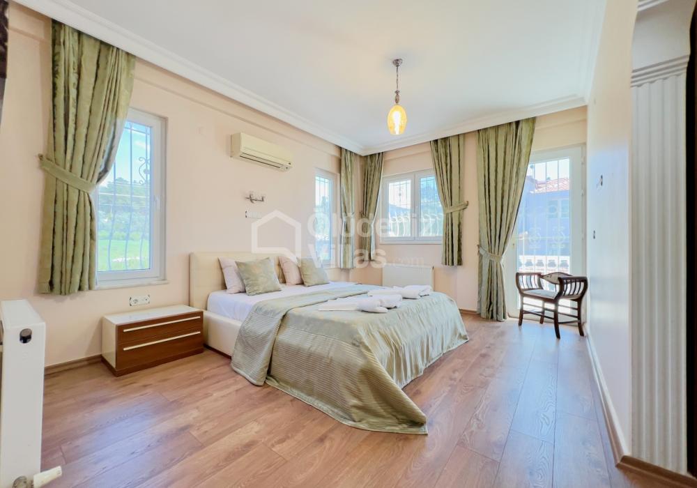 На нашей вилле 5 спален. В первой спальне есть двуспальная кровать, ванная комната, джакузи в ванной комнате, кондиционер и гардеробная. Во второй спальне есть две односпальные кровати и кондиционер. Напротив этой комнаты также есть туалет. Третья спальня имеет двуспальную кровать и кондиционер. В четвертой спальне две односпальные кровати, туалет-душ и кондиционер. В пятой спальне установлена ​​односпальная кровать. В общей зоне; Есть открытая кухня-гостиная, три кондиционера, телевизор и 2 санузла-душа.