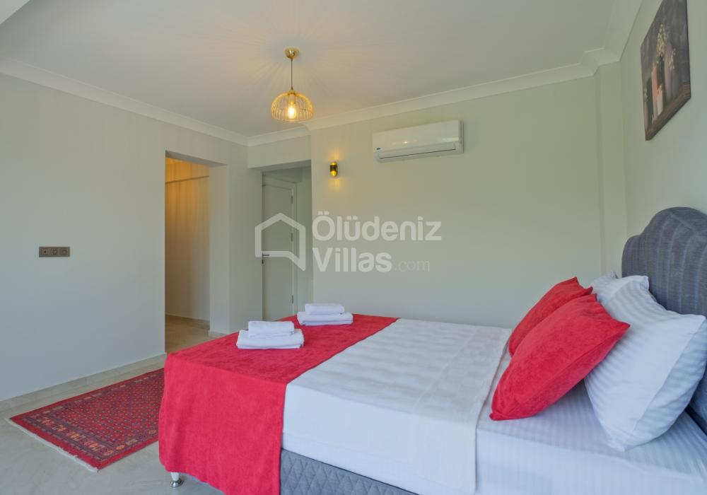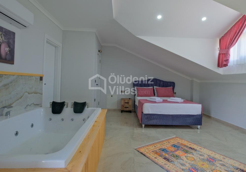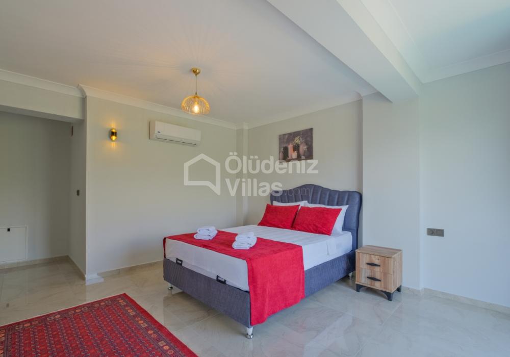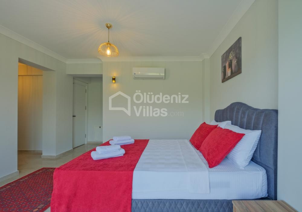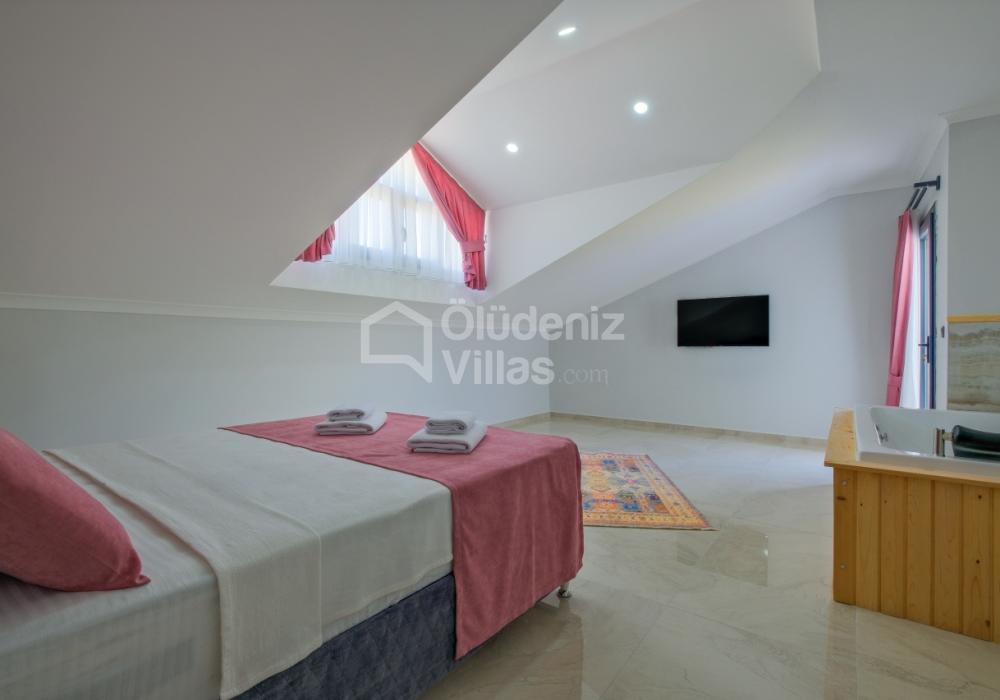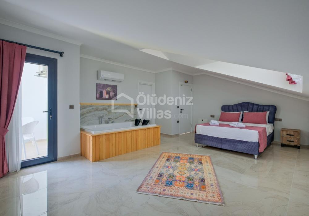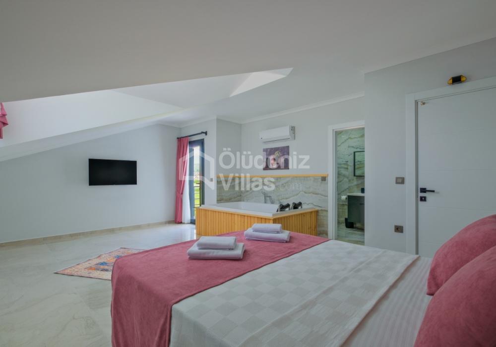1 спальня на 2 этаже: В спальне двуспальная кровать, прикроватная тумбочка с джакузи, гардеробная, кондиционер, телевизор, зона отдыха на балконе и собственная ванная комната.