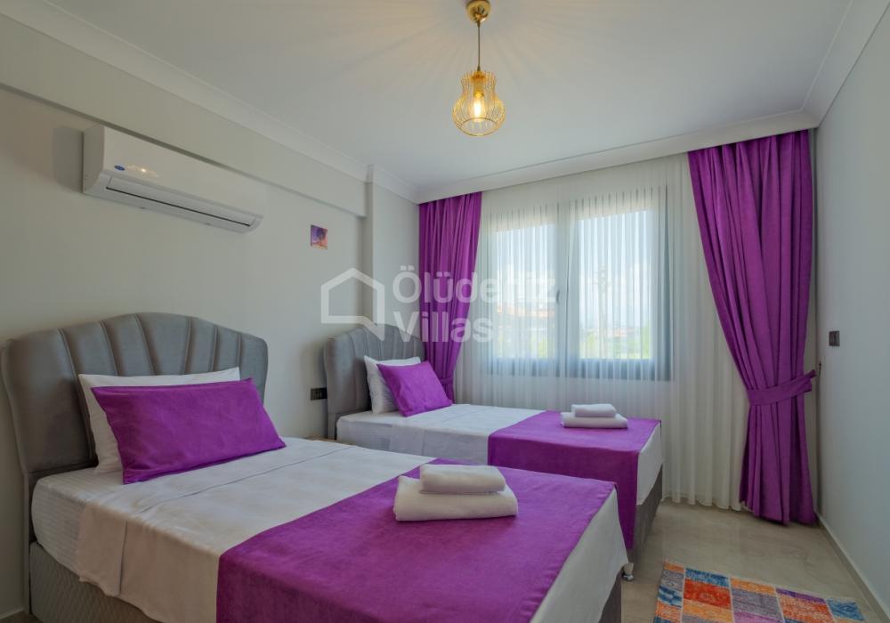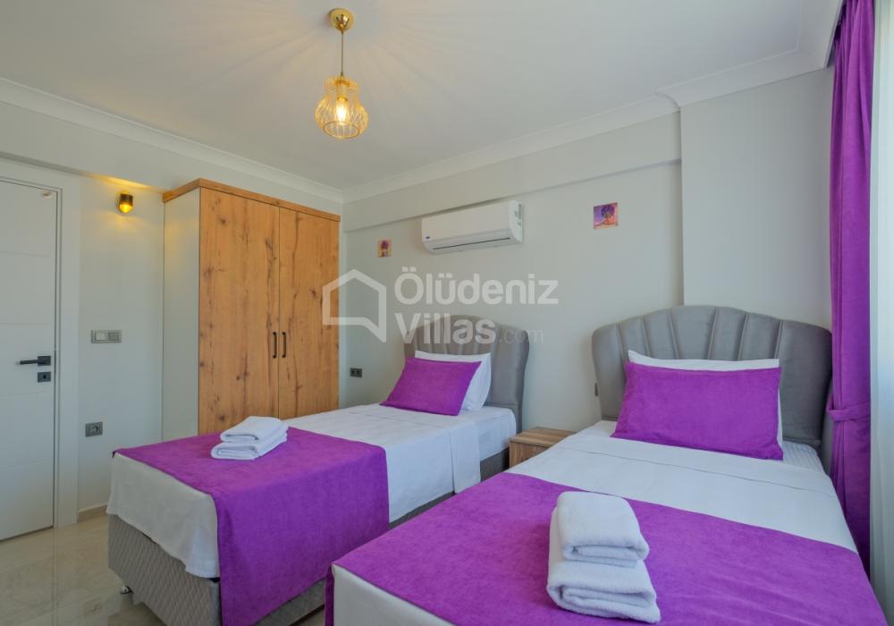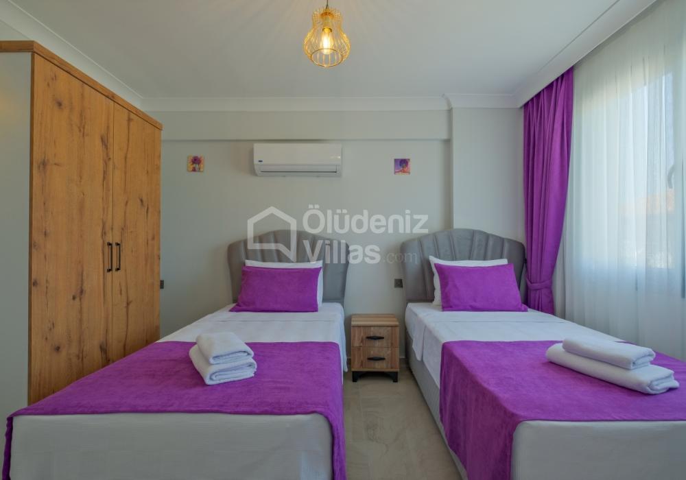 2. Спальня: В спальне есть 2 односпальные кровати, прикроватная тумбочка, шкаф, кондиционер и собственная ванная комната.