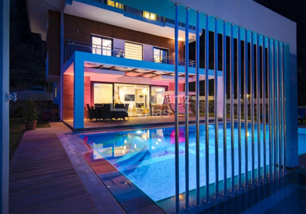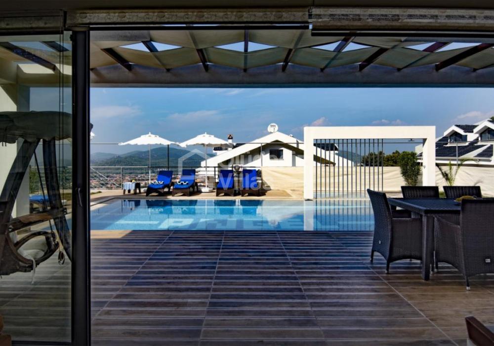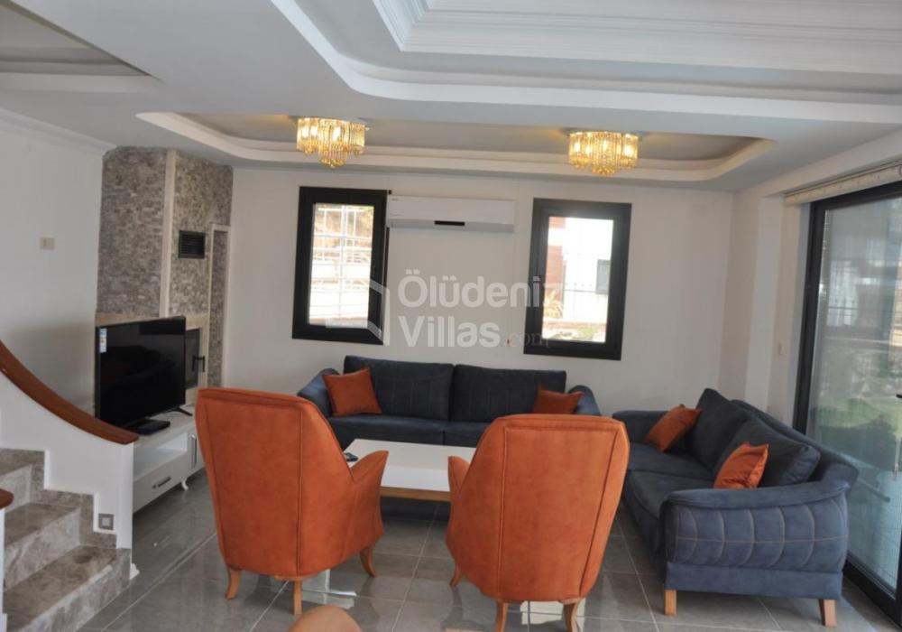 Гостиная: Гостиная, WC, спутниковый ресивер, LCD телевизор, сигнализация, интернет, кондиционер, обеденный стол, стулья и выход к бассейну.
