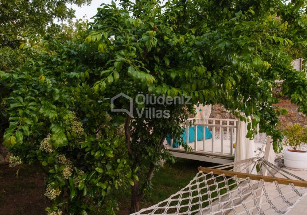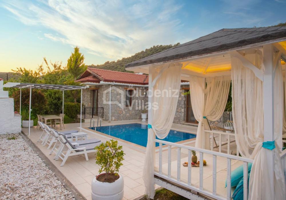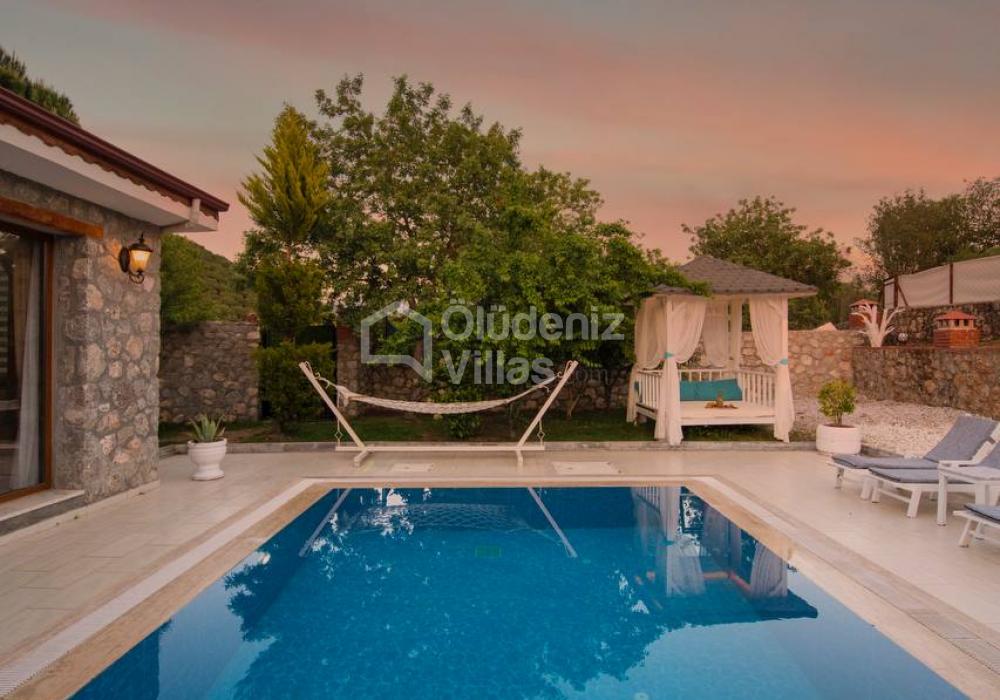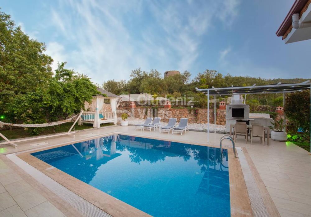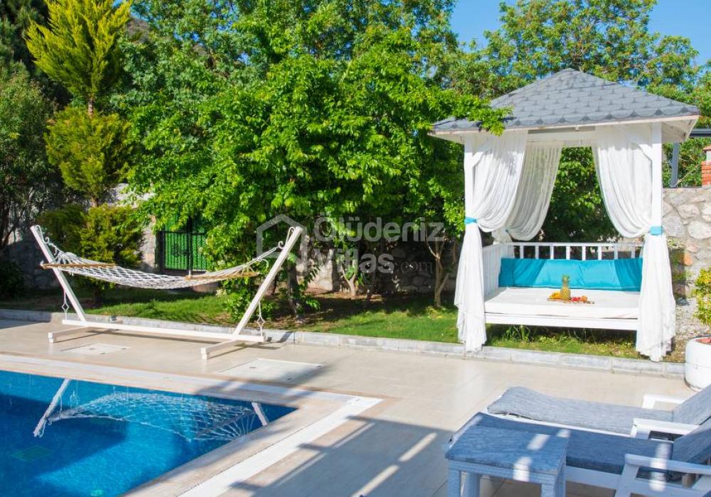 Villanın en dikkat çekici özelliklerinden biri ise doğa ile çevrili özel bahçesi ve yüzme havuzudur. Havuz terasında şezlonglar, şemsiye, yemek masası ve barbekü alanı yer almaktadır. Sessiz ve sakin ortamı sayesinde şehir kalabalığından uzak, doğayla baş başa huzurlu bir tatil deneyimi sunar.