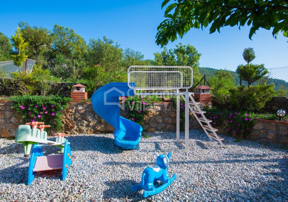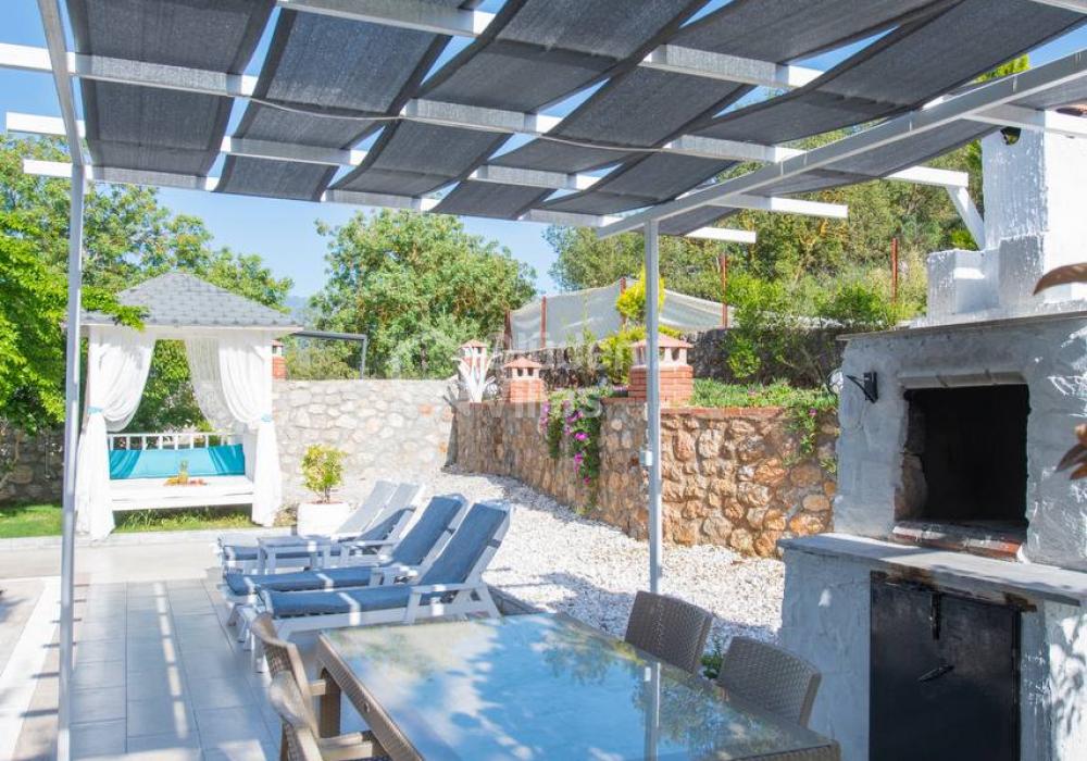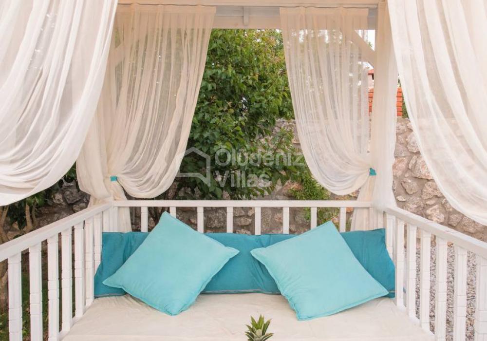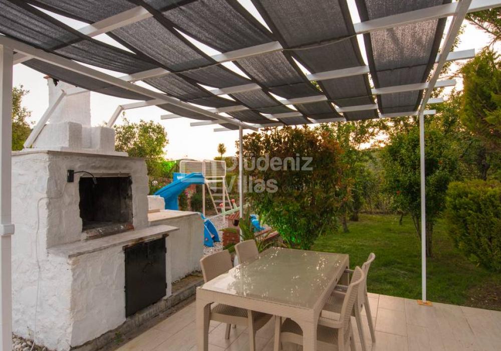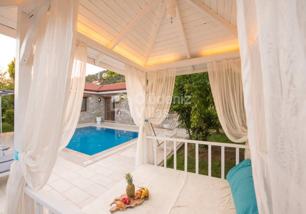 Villanın en dikkat çekici özelliklerinden biri ise doğa ile çevrili özel bahçesi ve yüzme havuzudur. Havuz terasında şezlonglar, şemsiye, yemek masası ve barbekü alanı yer almaktadır. Sessiz ve sakin ortamı sayesinde şehir kalabalığından uzak, doğayla baş başa huzurlu bir tatil deneyimi sunar.
